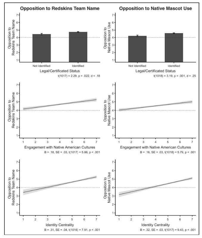 A recent study concluded that, on average, Native American participants opposed the use of Native mascots. Results are displayed based on Native identity (legal requirements, engagement in tribal activities, identity centrality), and sampled from a diverse group of Native Americans (this is the largest study examining opinions on Native mascots to date). This study offers both more nuance (a seven point opinion scale rather than a three point one, as well as an account for identity centrality) and an explicitly large and diverse sample size when compared to previous studies, such as those of the Washington Post.
