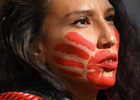 "A woman has a painted red hand over her mouth to show solidarity for missing and murdered indigenous, black and migrant women and children during a rally in 2019." (x)